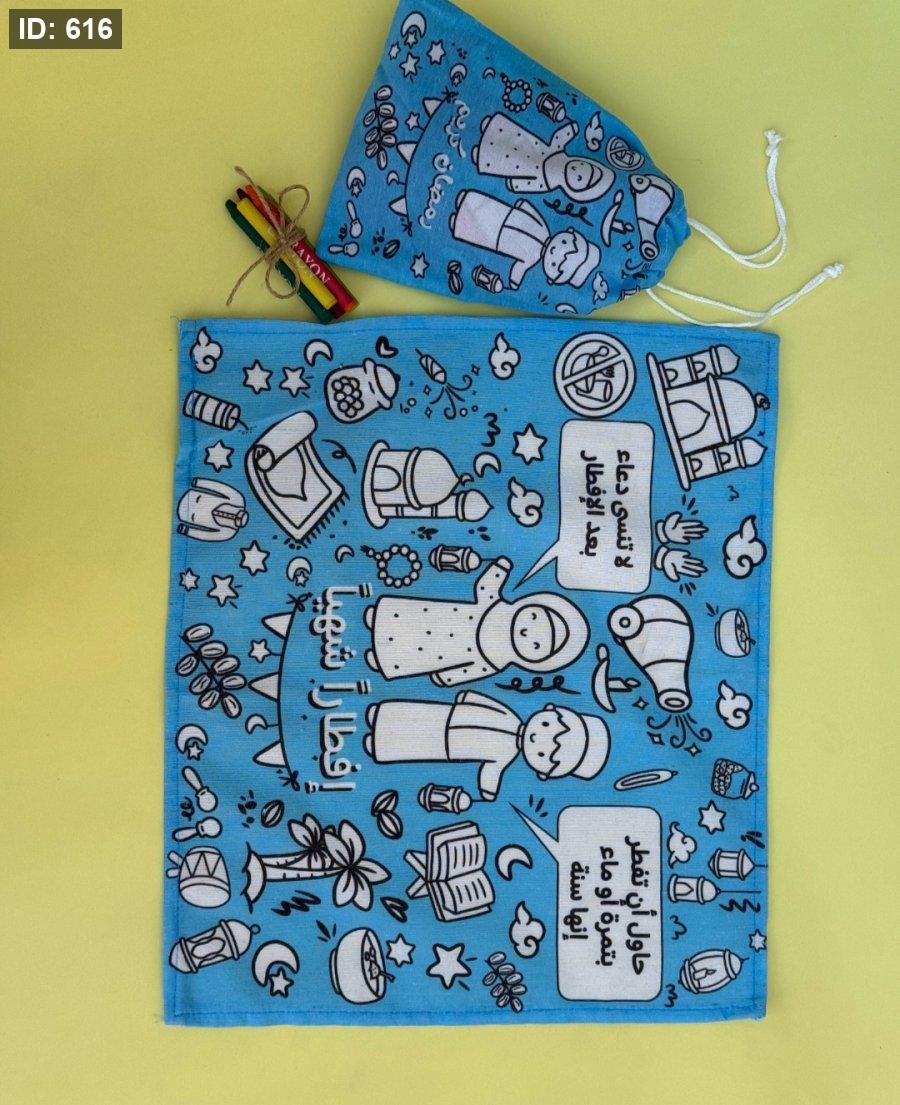 مفرش يوضع تحت الطبق في رمضان يلونه الطفل اثناء انتظار الاذان .. مع ملاحظات مكتوبة على المفرش لتذكير الطفل بدعاء الافطار وسنن الافطار