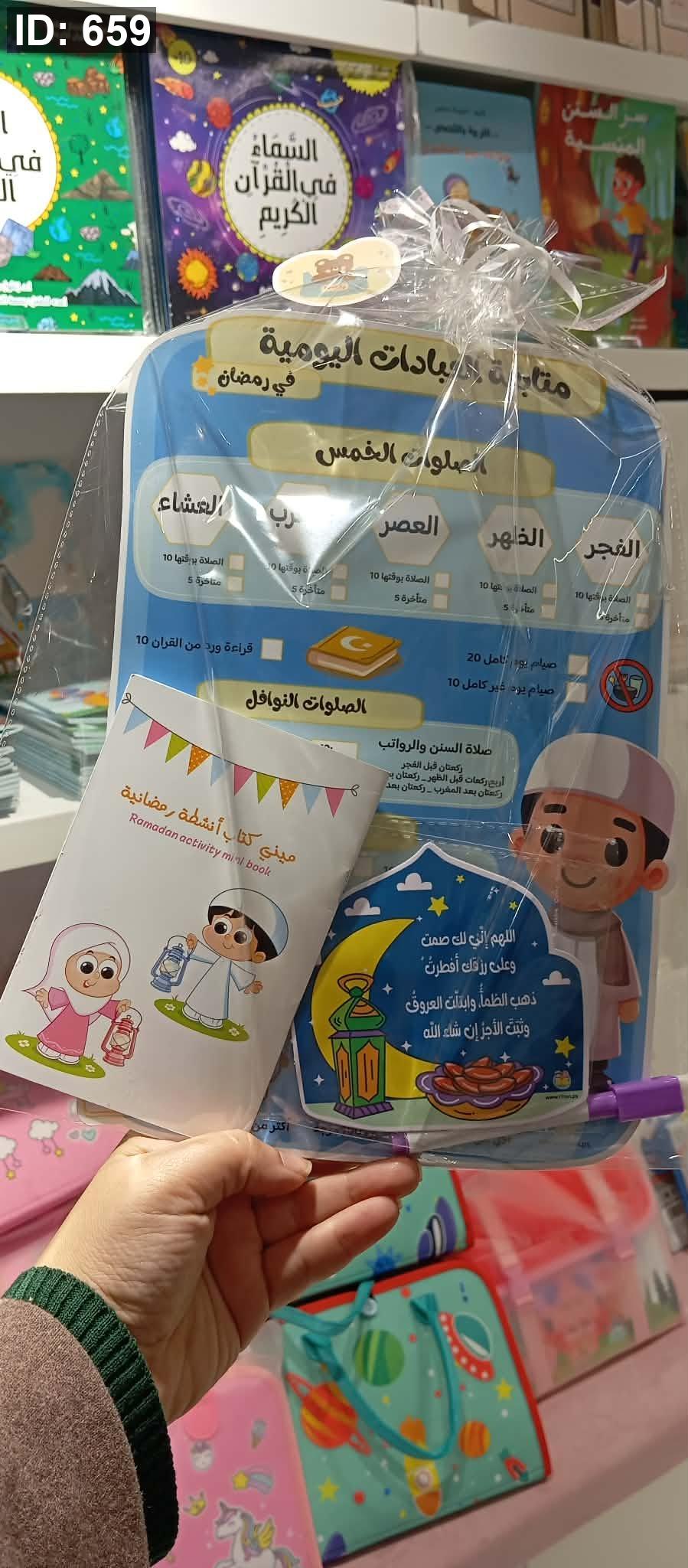 حزمة جدول تتبع العبادات الرمضانية + قلم اكتب وامسح+ ملصق دعاء الافطار+ دفتر انشطة